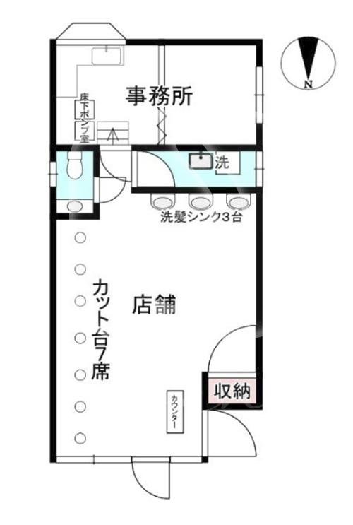 セット面7席、シャンプー台3台、受付カウンターのレイアウトです。